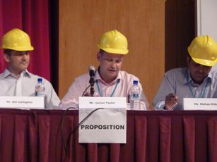 The team proposing the motion (the "hats") was led by Bill Gallagher, with team members James Taylor and Mohan Pillay. They were presented with yellow construction safety helmets to wear for the debate. The opposition team (the "red shirts") was led by Eugene Seah, assisted by Calvin Pereira and Daniel Koh. All opposition team members wore red shirts.